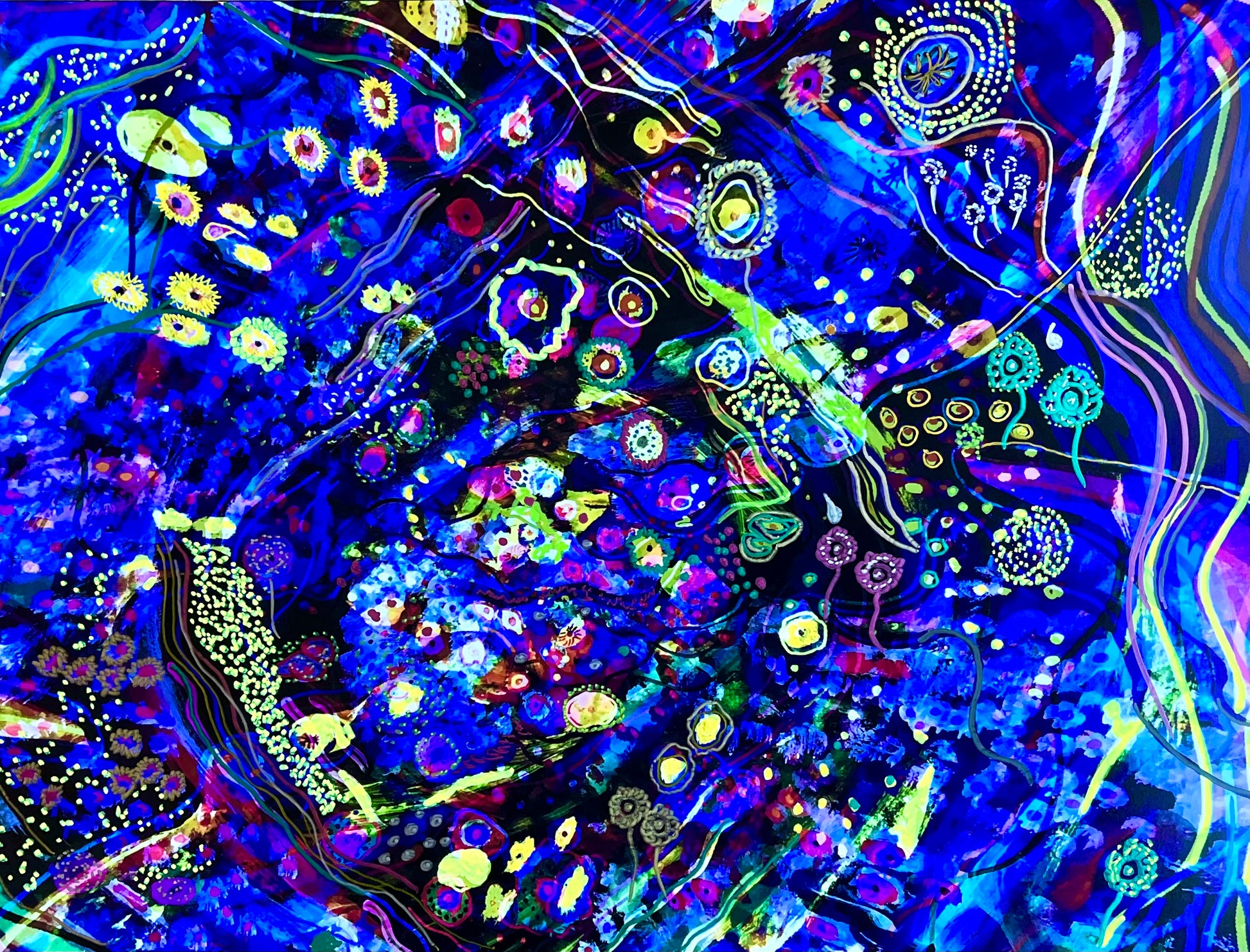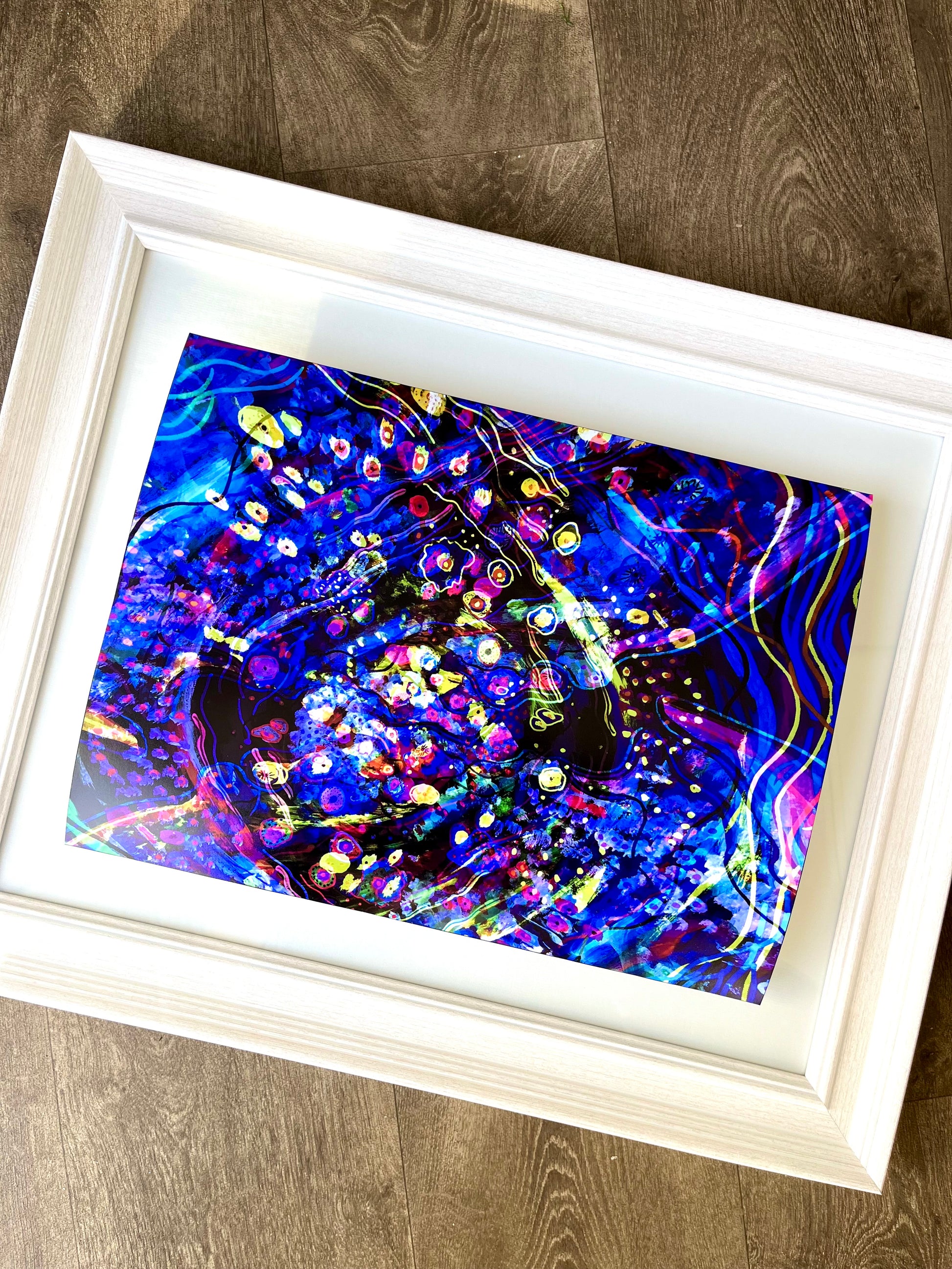 A beautiful floral swirling abstract with vivid blues yellows and pinks in harmony .