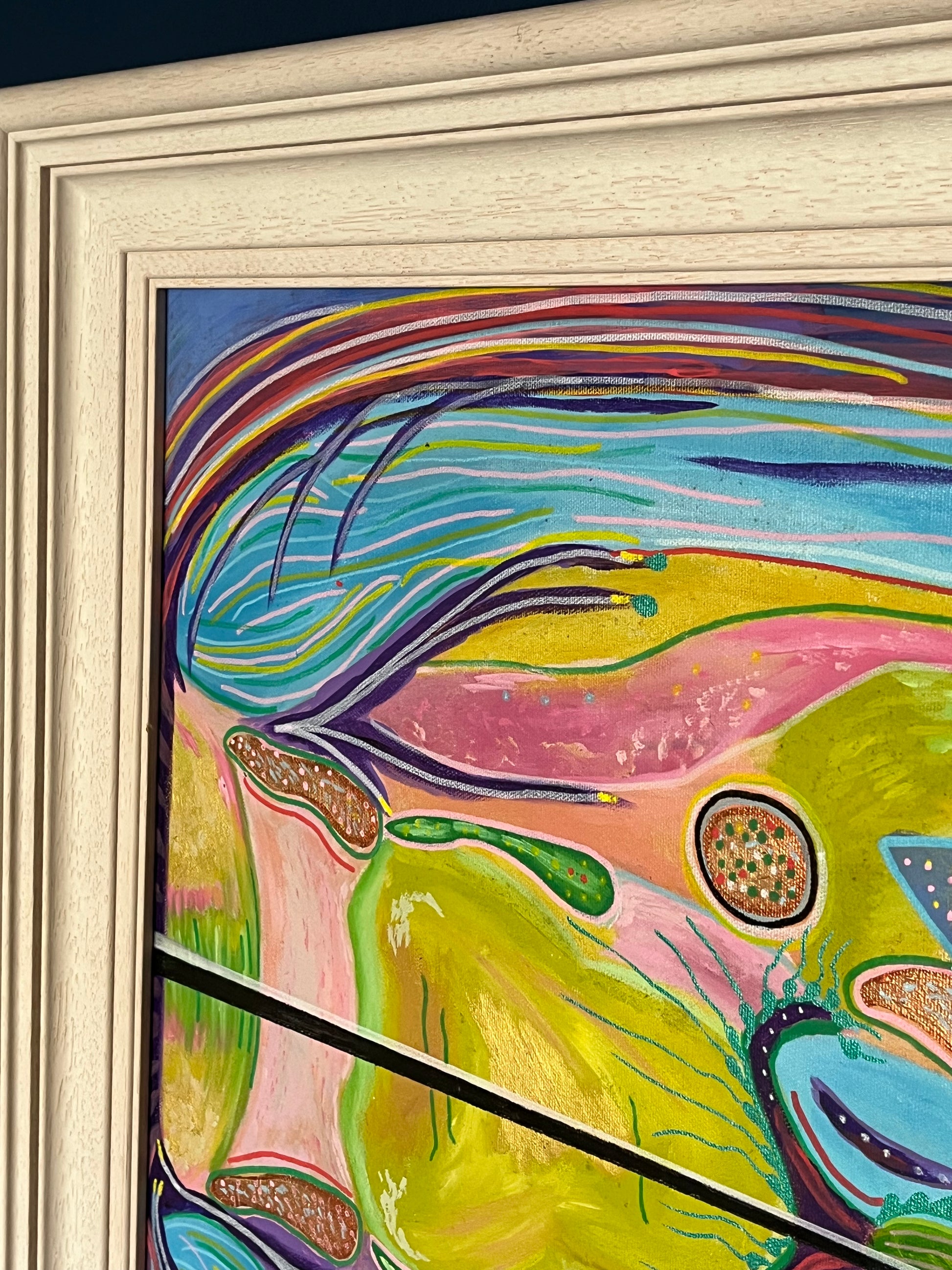 A 20x24 inch painting in acrylics and pen in huge detail imitating a memory of the artists visit to “Lake Tekapo in New Zealand and the vivid reflection in the lake at that time .