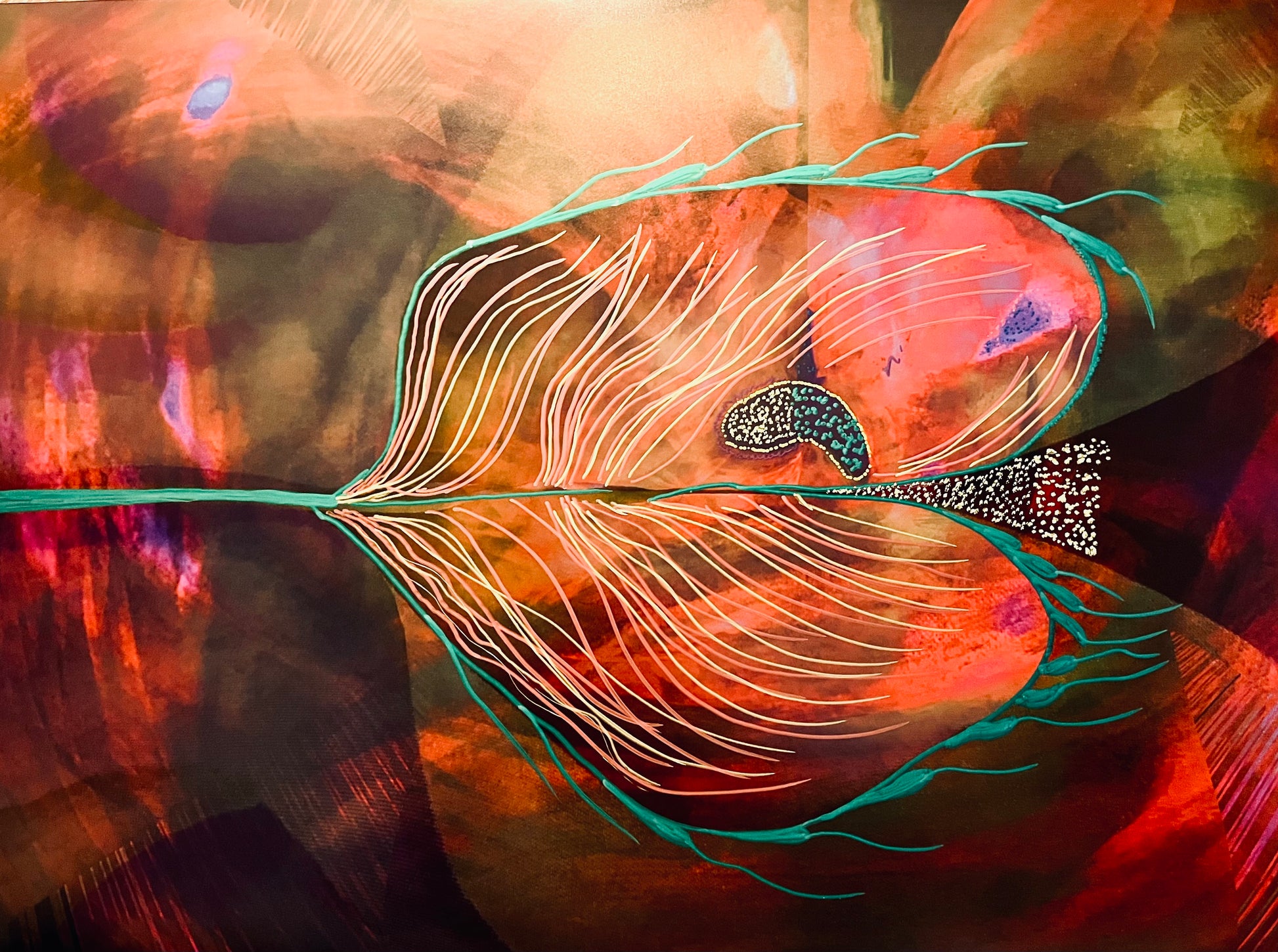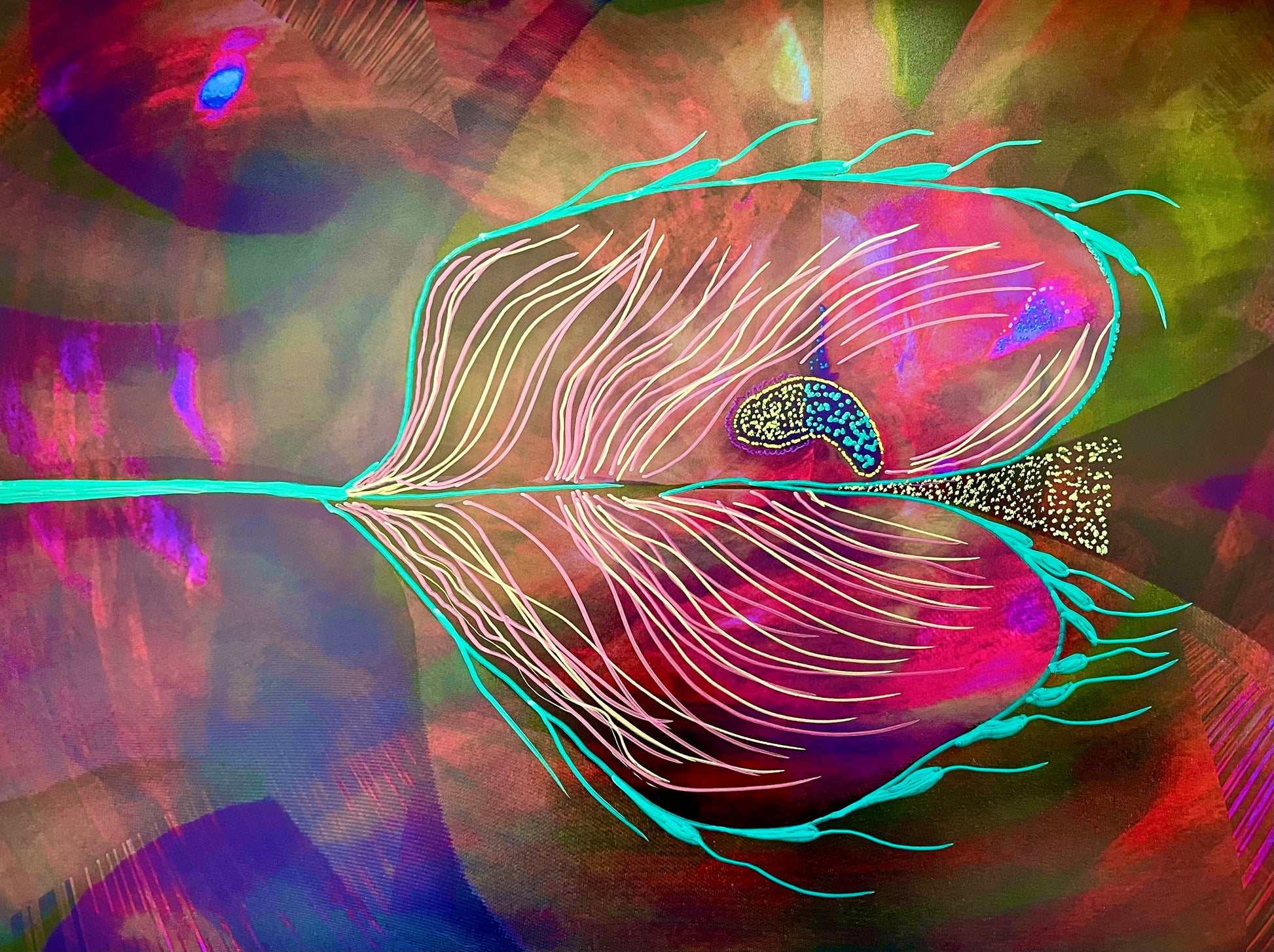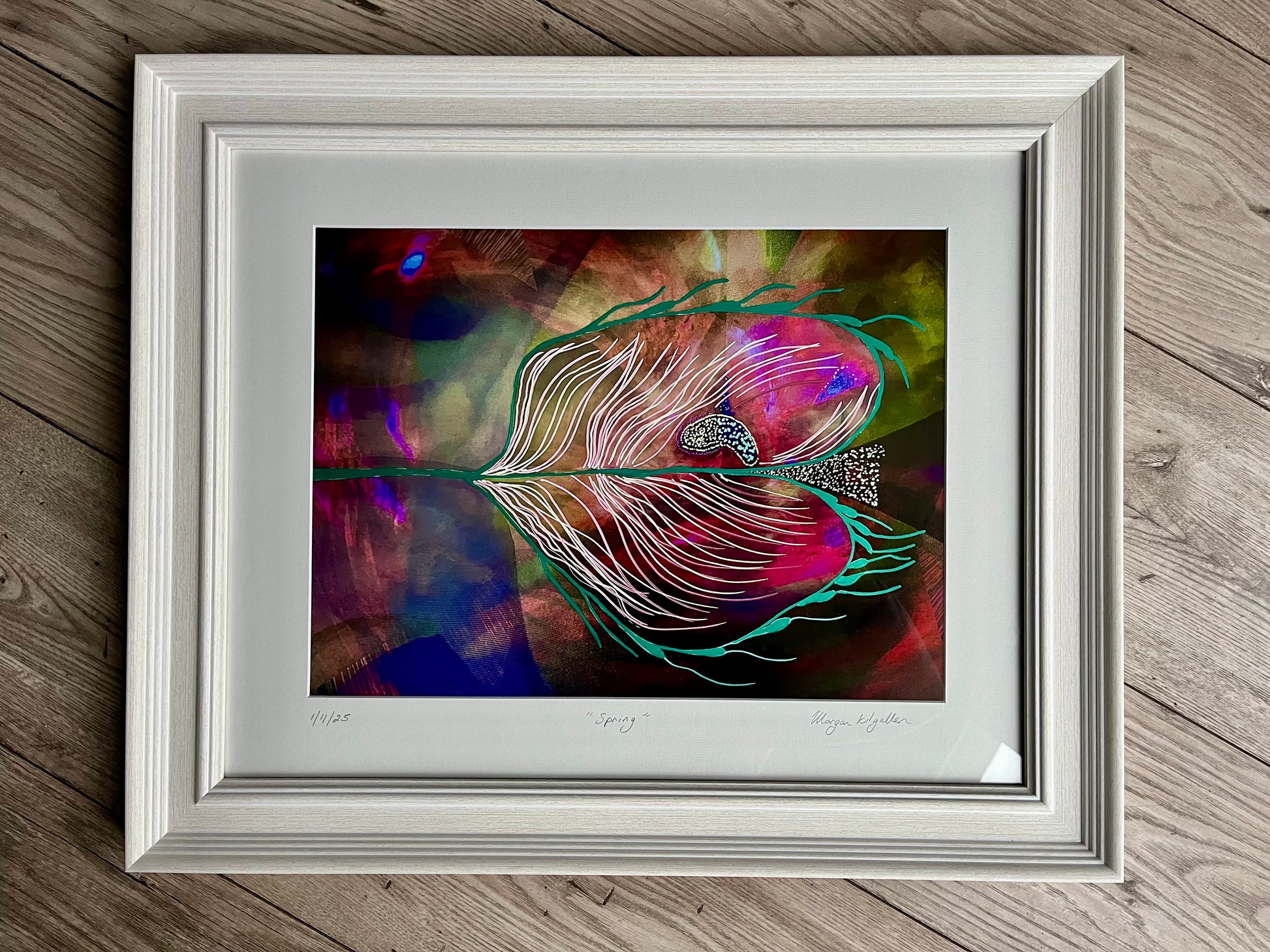 A gorgeous print of one of Morgan’s paintings hand embellished with metallic greens and pinks .