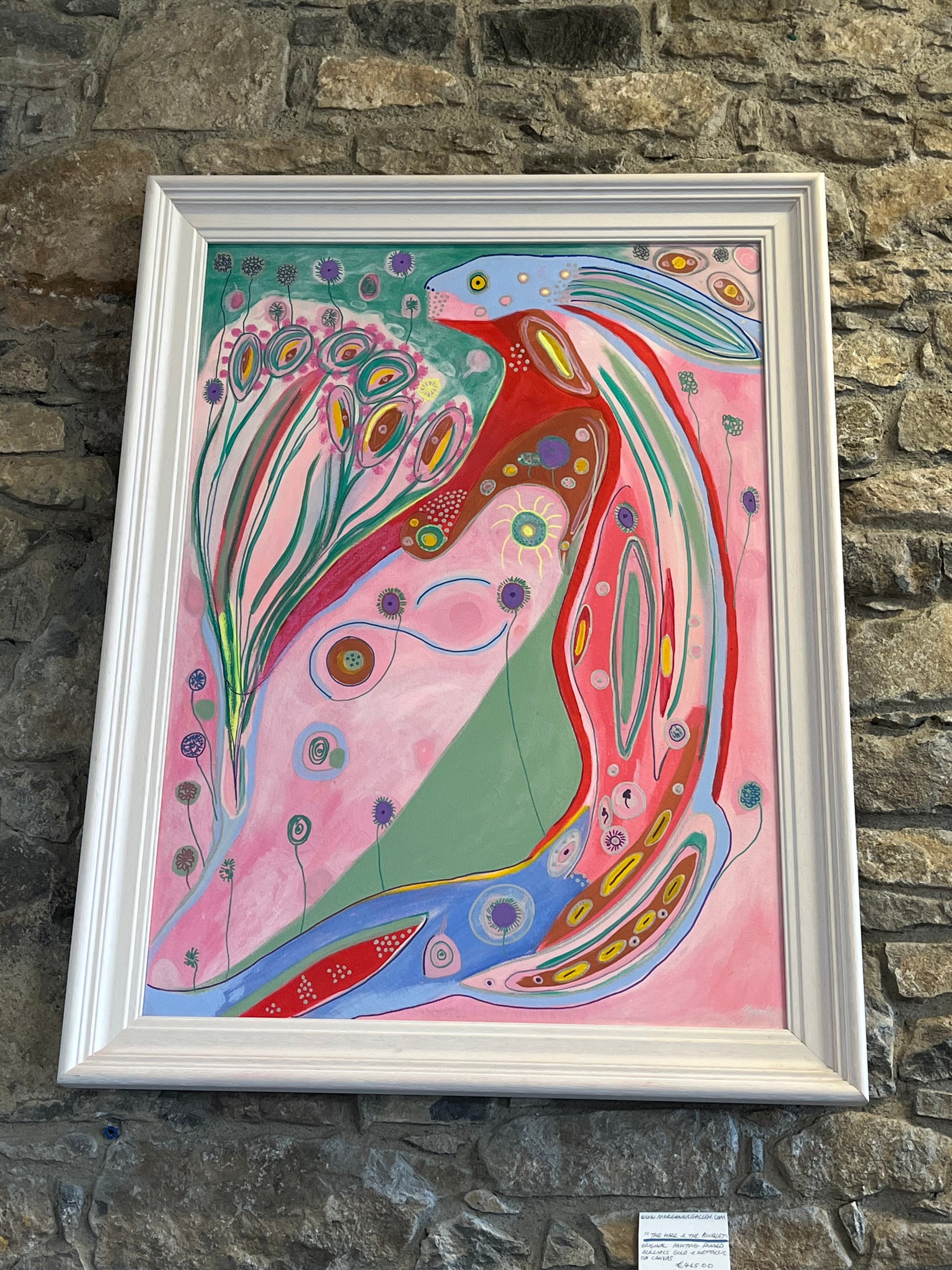 40” x 20 “ acrylics on canvas and framed in limed ash wood .