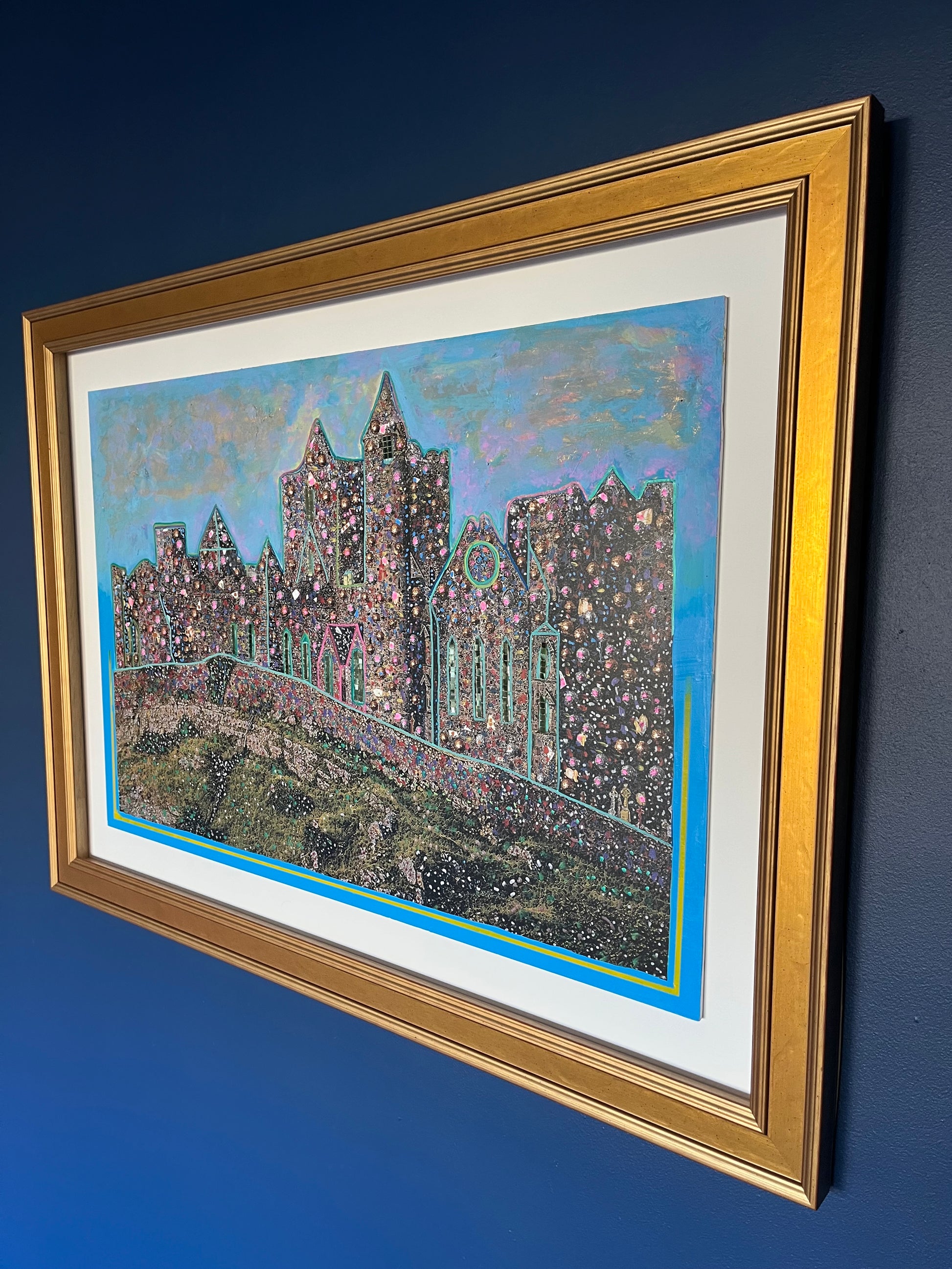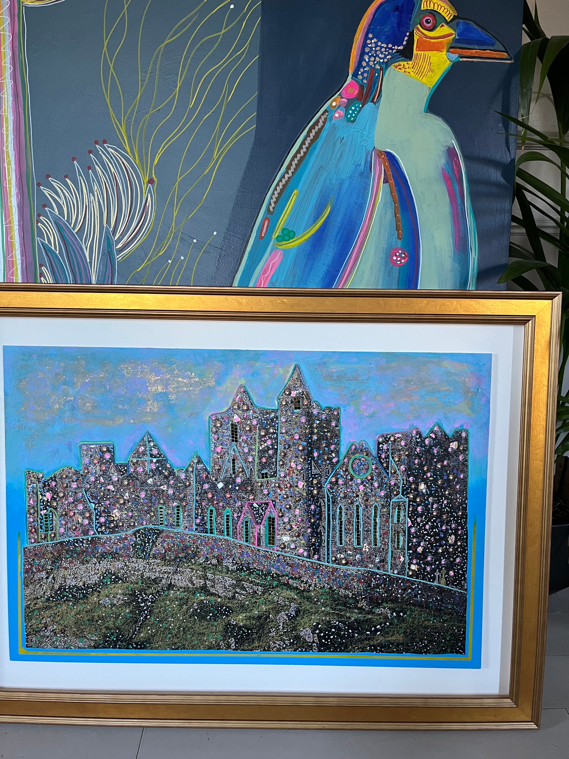 A stunning 36” x 20” painting on board ,gold leaf applied ,mosaic gold individual mirrors applied to window apertures ,adorned with pinks and greens and blues in metallic paint .